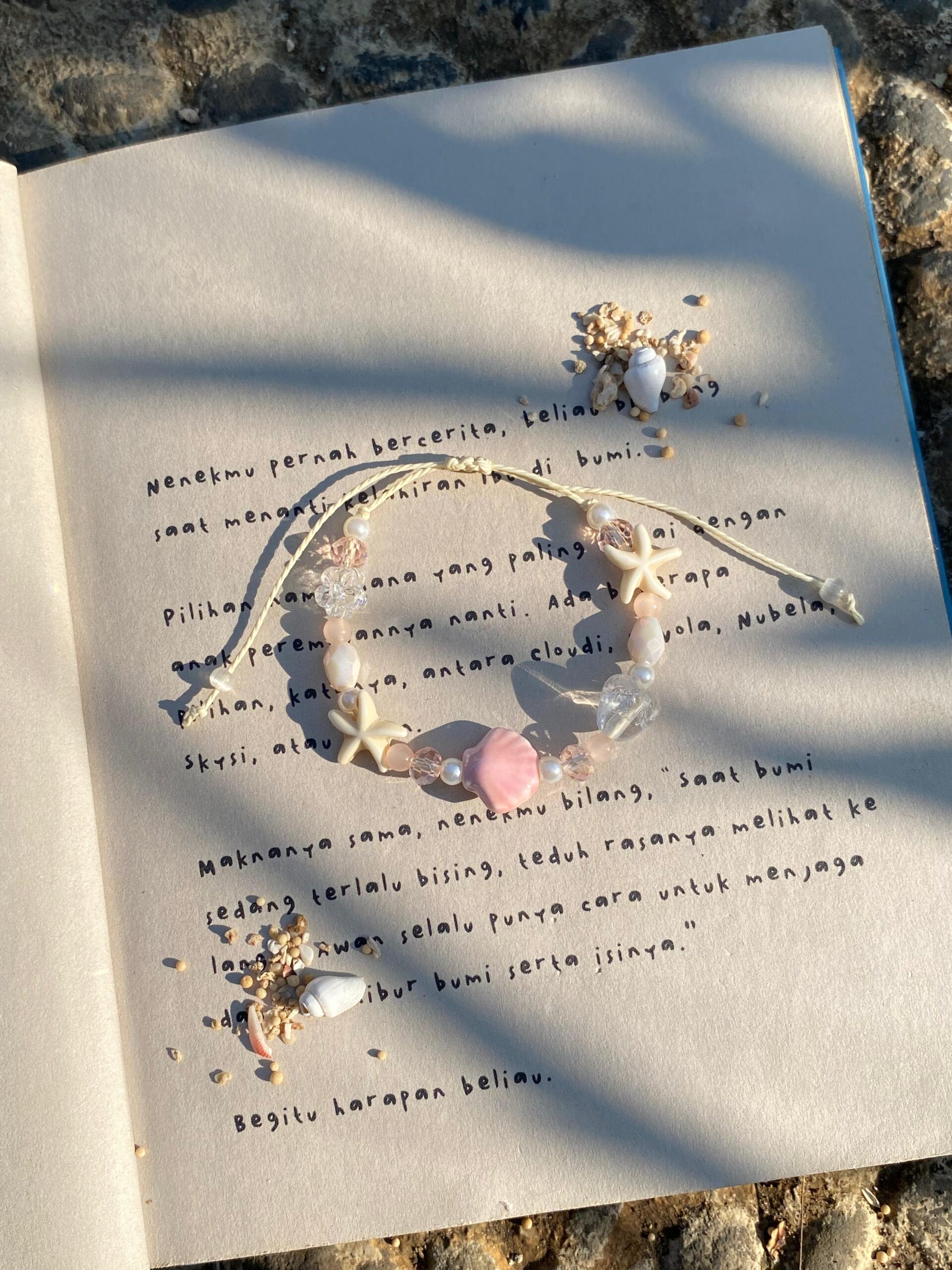 Aurora Seashell adalah gelang handmade bernuansa laut dan senja, dibuat dari manik keramik dan manik Ceko berkualitas tinggi. Dirangkai dengan tali waxed polyester yang kuat, dihiasi bintang laut dan kristal transparan, menghasilkan kesan natural, elegan, dan cocok untuk tampilan kasual.