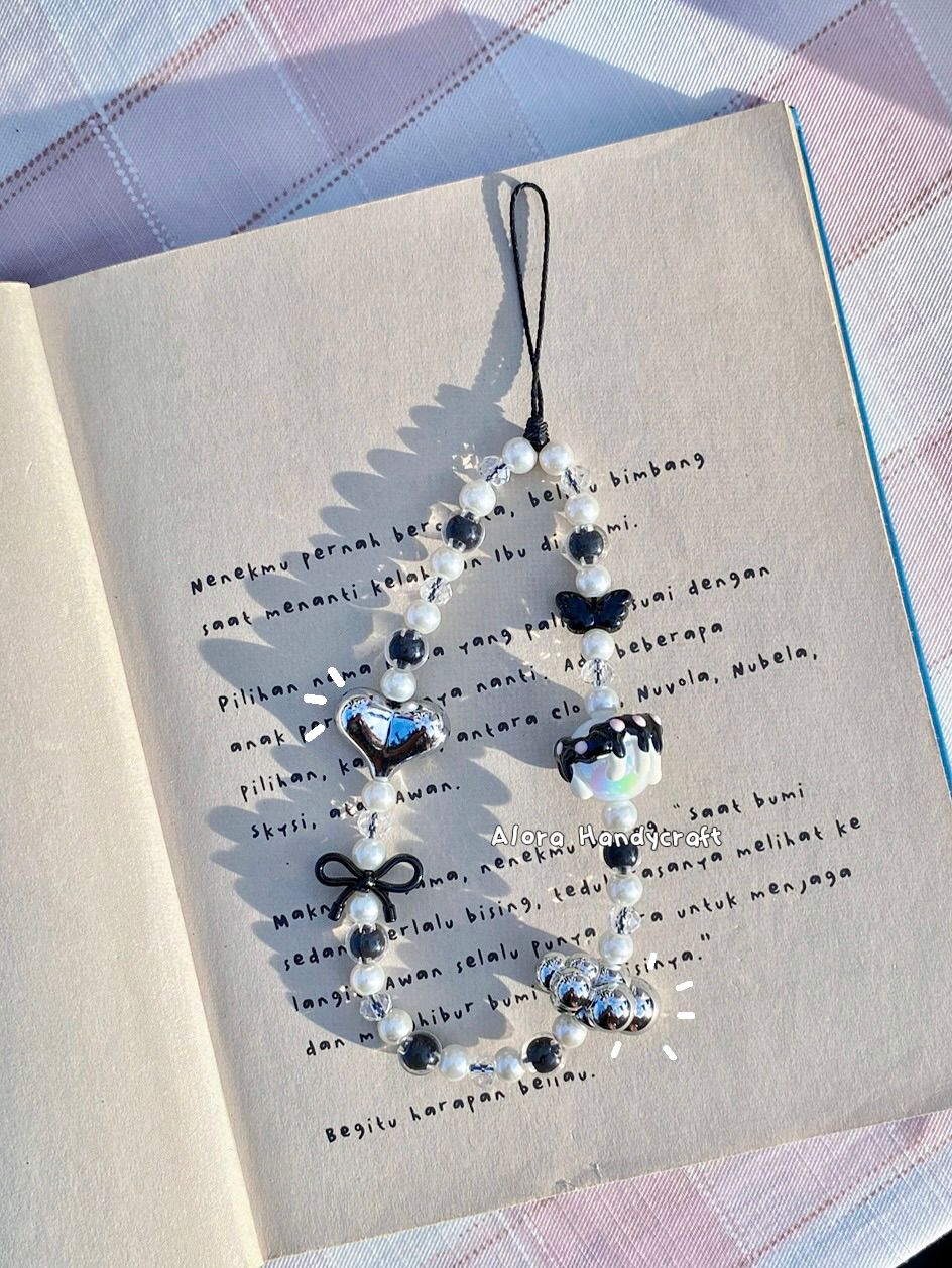 Midnight Grace adalah strap handmade bernuansa monokrom elegan, dibuat dari manik luxury, painting, besi, dan manik Ceko berkualitas tinggi. Dirangkai dengan tali waxed polyester yang kuat, menghadirkan perpaduan hitam–putih–silver yang berkesan anggun, modern, dan berkelas.
