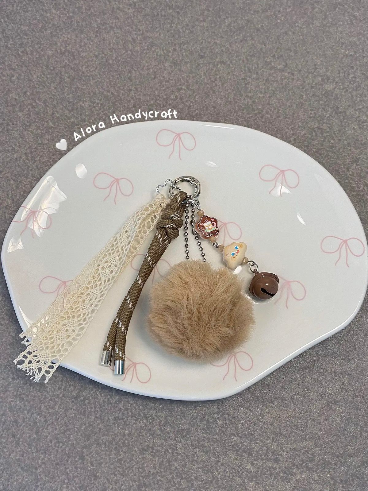 Caramel Cozy Charm adalah keychain bergaya soft vintage dengan pom-pom coklat muda, charm karakter lucu, lonceng kecil, serta detail renda dan tali anyaman. Kombinasi warna netralnya menghadirkan kesan hangat, manis, dan estetik untuk melengkapi tas atau gantungan kunci.